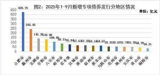 其中,发行规模较大的市分别为合肥市425.75亿元、占比24.2%,滁州市241.81亿元、占比13.7%,芜湖市141.26亿元、占比8.0%,阜阳市132.48亿元、占比7.5%,合计占新增专项债券发行总量的53.4%。